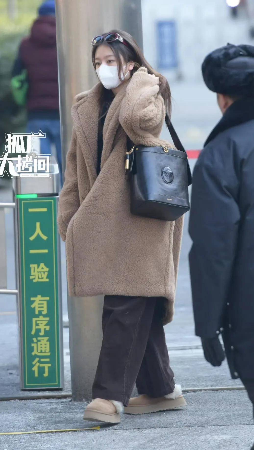 别的年轻女星都没欧阳娜娜这么抗冻,就拿李兰迪来说,她穿了一条棕色羊羔绒大衣,搭配同色系的雪地靴,明显保暖得多。她戴在头上的墨镜,也增加了一些时尚感;倒是那个名牌黑色包包,看起来平平无奇,跟造型还不太搭。