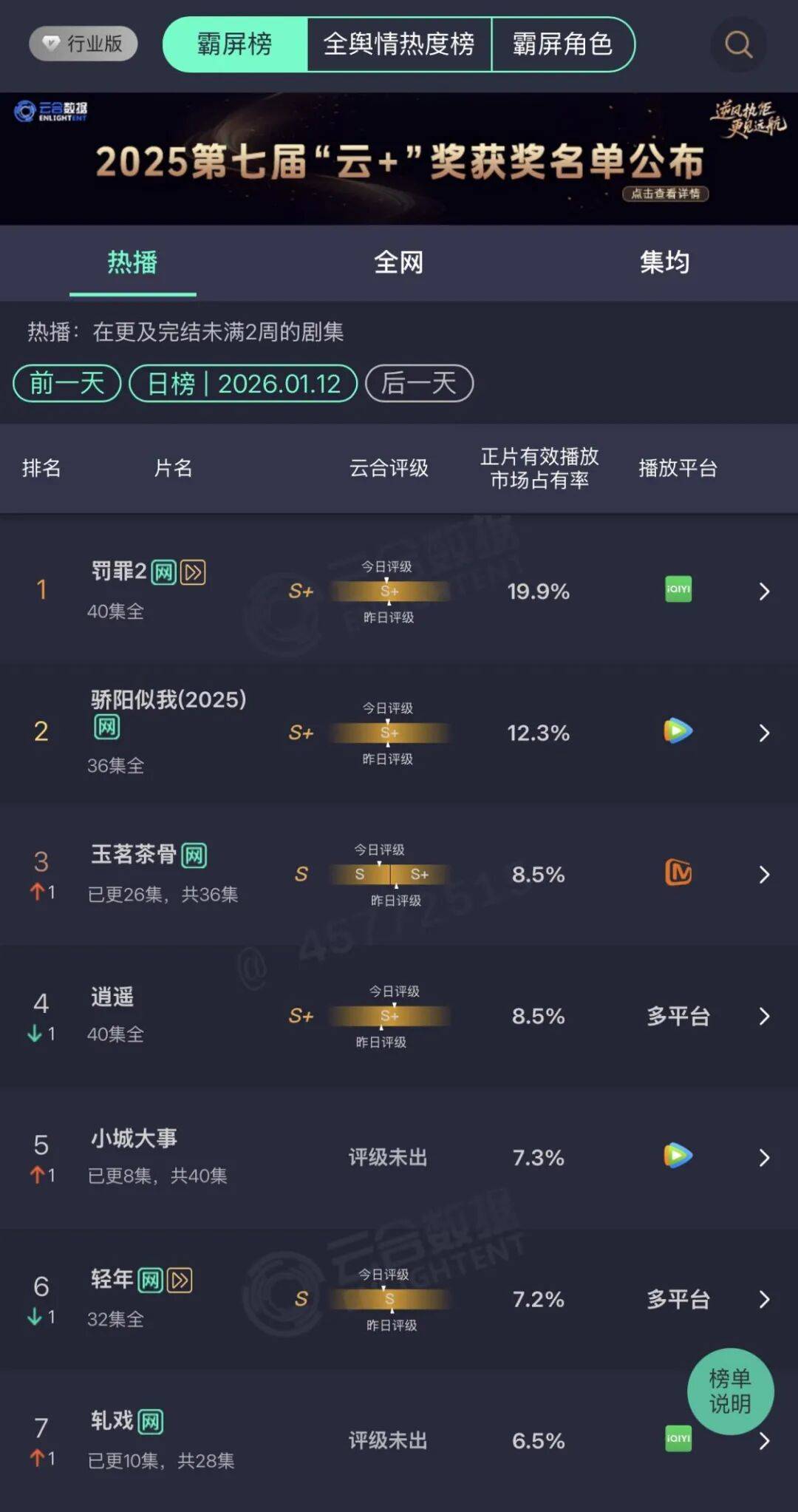 不过,捷成股份在这场开年秀中推出的《罚罪2》,表现得相当争气。该剧不仅拿下爱奇艺2026年的首个“破万”,更一度将前作重新拉回云合热播榜前十,而其自身也持续以断层领先的态势霸榜第一,云合市占率高达26.9%。