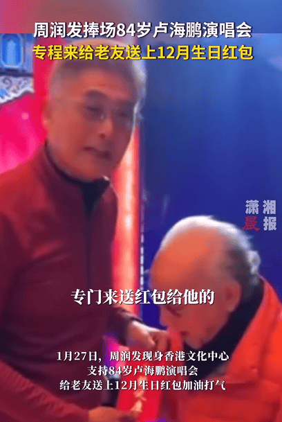 1月27日,周润发现身香港文化中心,支持84岁卢海鹏演唱会,给老友送上12月生日红包加油打气。