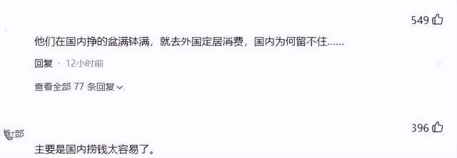 有网友感叹说:他们在国内挣的盆满钵满,就去外国定居消费,国内为何留不住……。