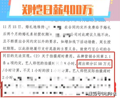 直到最近郑恺的收入曝光,大家才明白。近日有网友晒出一份广告拍摄合同,上面显示郑恺每天的拍摄时间为8小时,超过8小时的部分要以50万每小时的加班费来计算,不足1小时也要按1小时计算。根据这个数字推论,郑恺每天工作8个小时,日薪就能达到400万,比之前爽子的208万还要多得多。