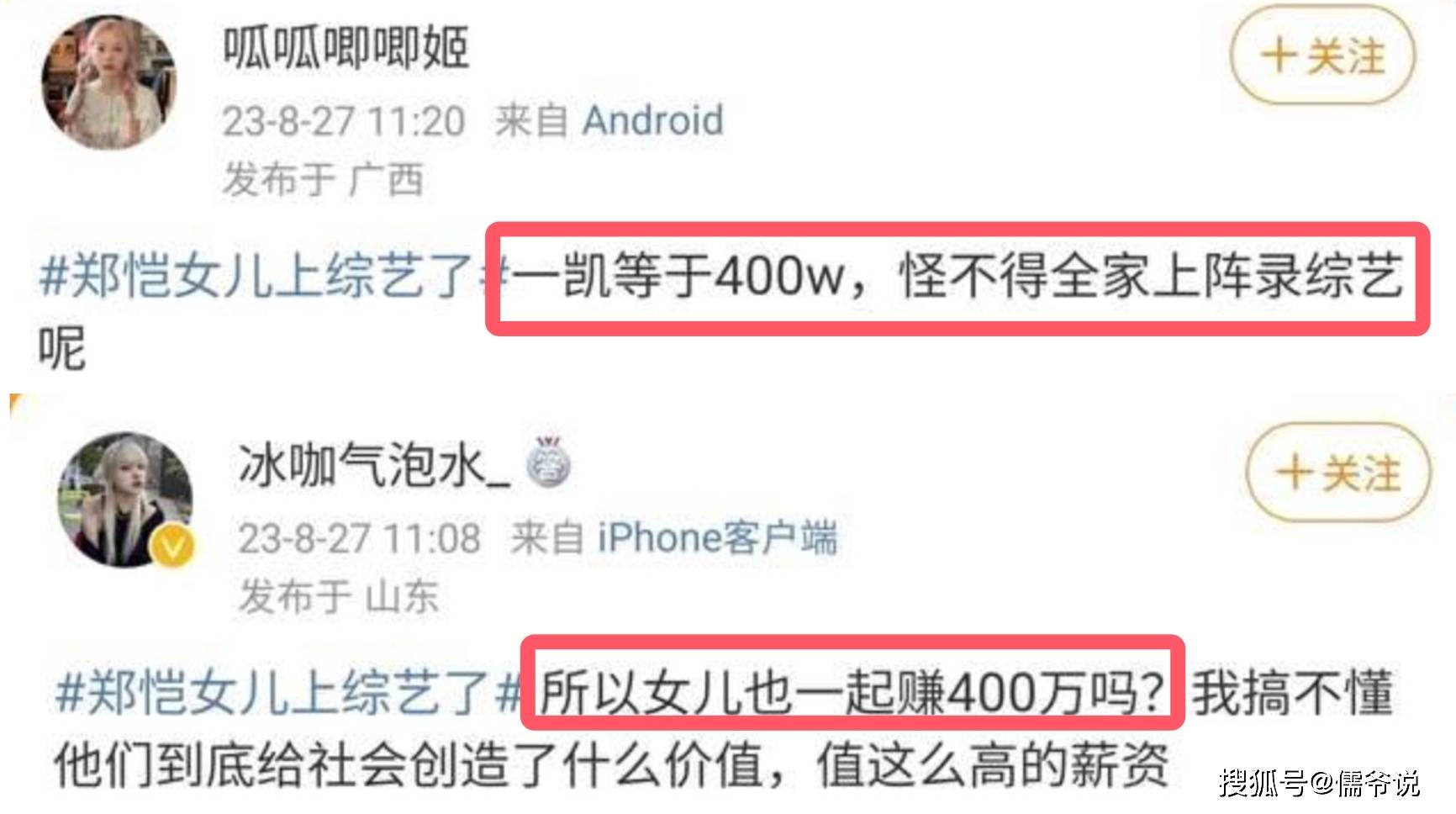 但是不管是哪种,郑恺再次引发争议了,网友们纷纷表示“一恺等于400万,换我也叫上全家上阵录综艺”,而有的则发出质疑难道他女儿也要一起赚400万吗?并表示不知道他们为社会创造了什么价值,值得拿这么高的薪资。