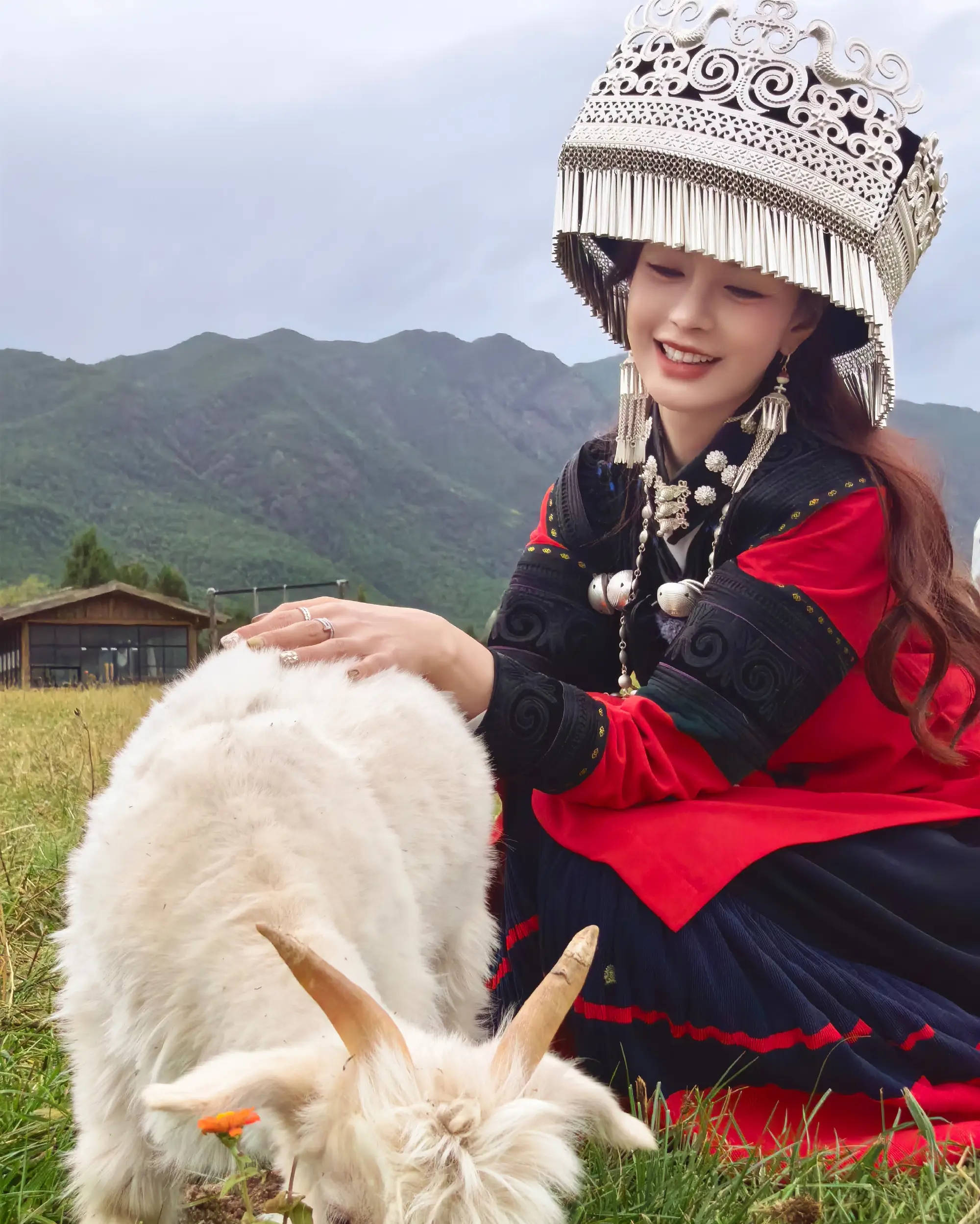 身着民族盛装的沈梦辰,恍惚间流露出地母系的温柔。繁重的银饰头冠,花纹古朴大气,垂坠着一排流苏,碰撞之间发出叮当声响,亦如对大山的礼赞。耳畔长坠的耳饰,摇曳间情韵尽现,却仍难夺绣裙的风头。红黑撞色的冲击,夹杂着遥不可及的故事感。袖口的盘龙纹样,更是岁月在针线上的沉淀。摸着小羊,她笑容如初春暖阳,青山草地之间,只余一份纯粹的亲近。