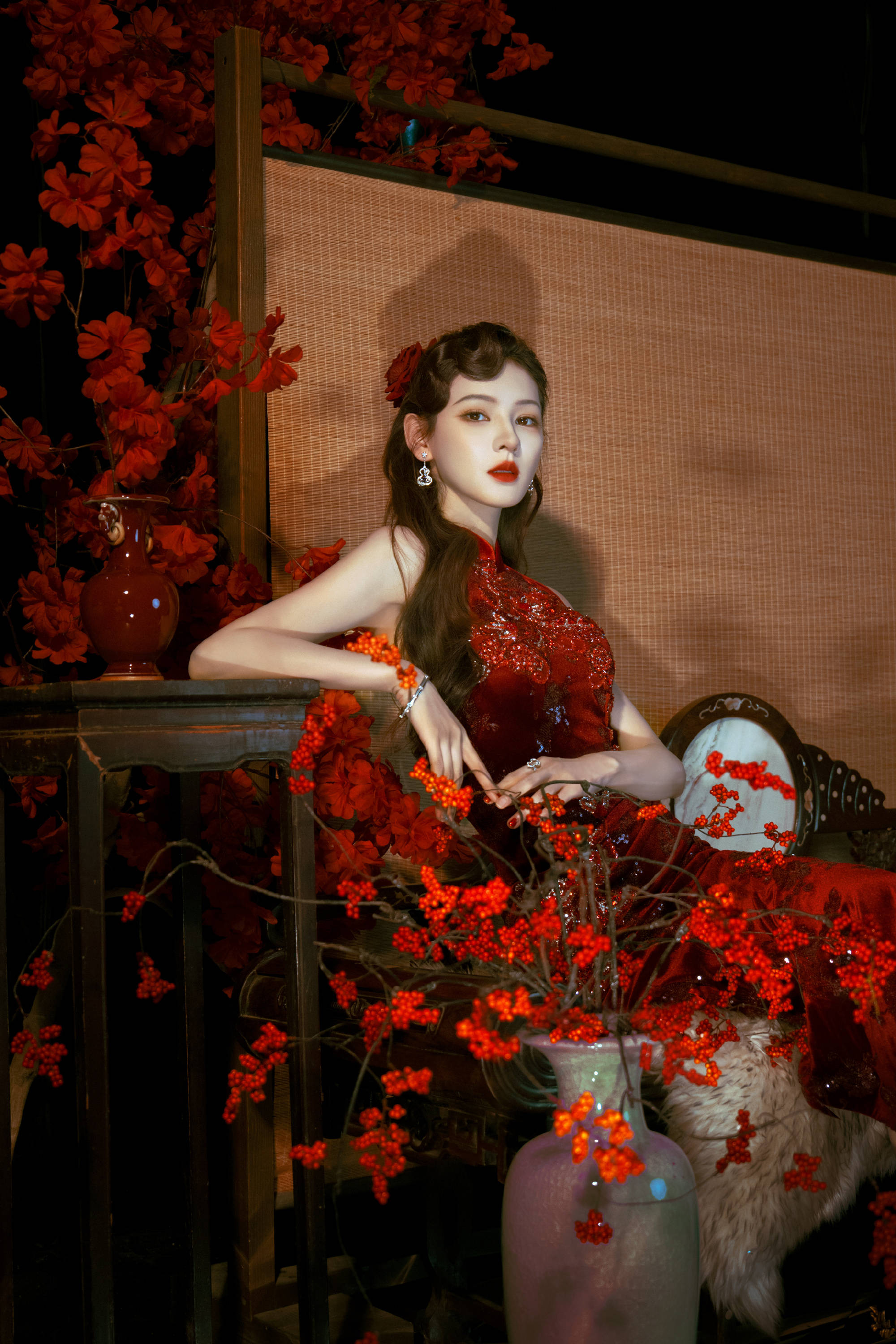 焦黄的光投射在素雅的竹屏风上,张予曦斜倚床边,邀人共赴红楼绮梦。色彩浓郁的短绒旗袍,妖冶胜血,泛起微光,质感华贵而雍容。钉珠组成的花朵,以暗纹提花为影,攀爬着纤细的脖颈和款款腰肢,在冷白肌肤的映衬下,竟产生了奇妙的攻击性。梳着老上海手推波,张予曦混血感的五官因而也有了一份异次元的精魅感。乱舞的红花,如鬼魅摄魄,恨不能施展所有身法,几欲吞噬空间。地上一滩银液,歪歪扭扭地倒影着所有,恰如“朦胧见,鬼灯一现,露出桃花面”,叫人虚实难辨。
