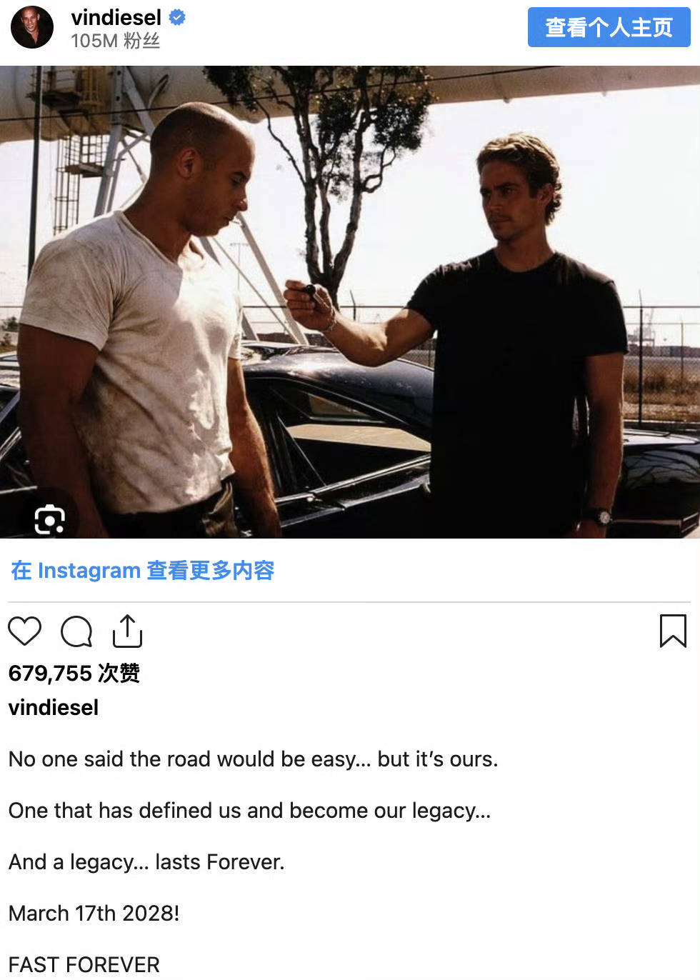 主演#范·迪塞尔#发ins庆祝该片终于定档,他分享了与已故的该片演员保罗·沃克合影,并配文:“没人说一路上会很轻松,但这是我们的路,这条路定义了我们,且将成为我们的传承,这份传承,将是永远。”