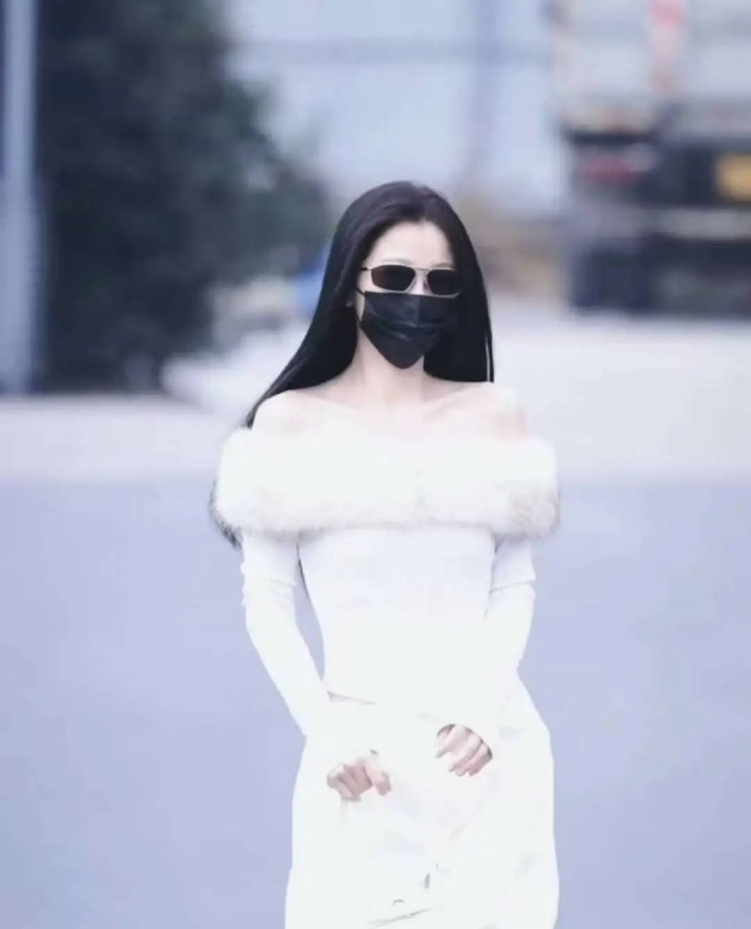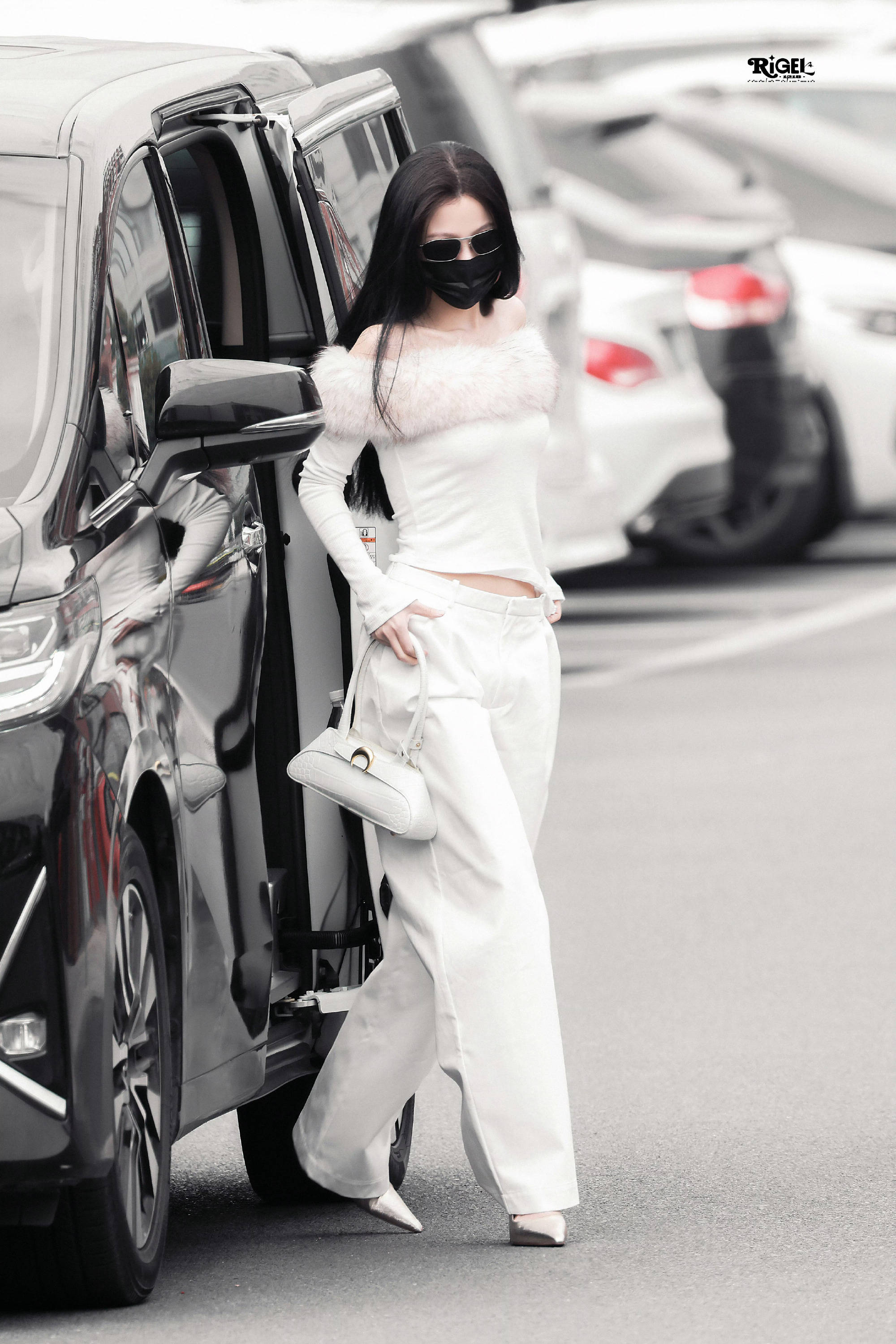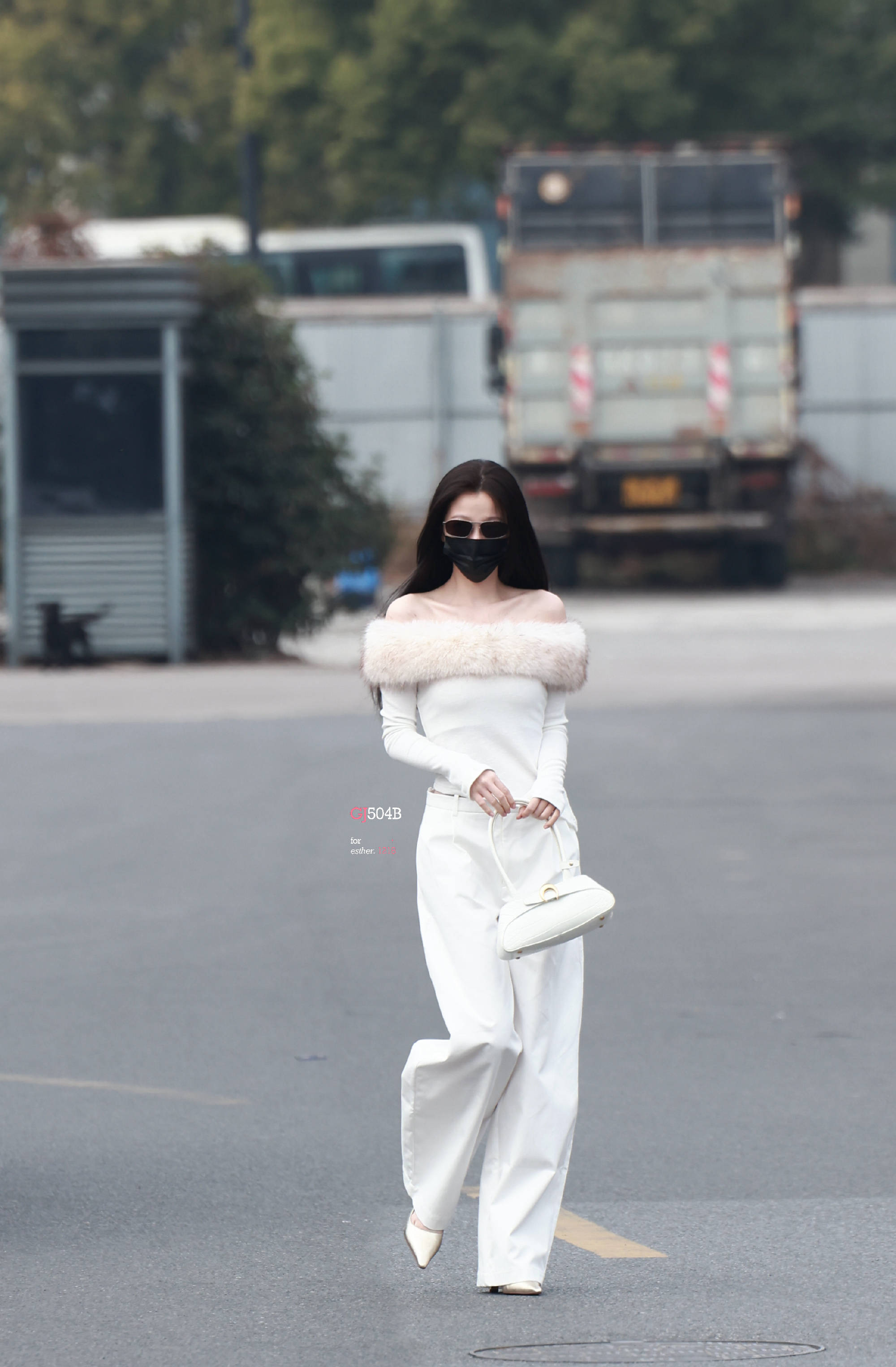 虞书欣走下房车,全白造型气场全开。