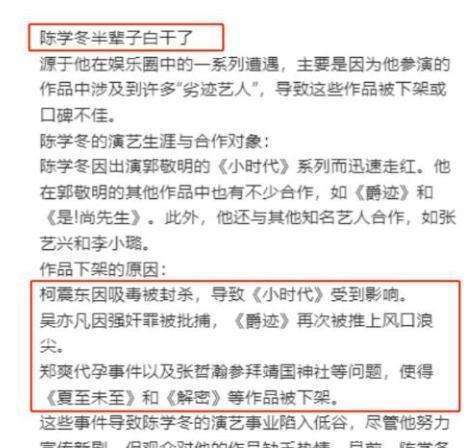 也许有人会说,演员们饰演罪犯的角色多了去了,这不过是巧合罢了。然而,陈学冬的遭遇,确实让人感到特别悲伤。无论他是命运不济,还是在表演上过于投入,过于沉浸,最终导致生活和现实变得如此相似,我们还是要学会在生活中避免那些不吉利的言辞和行为,为自己的未来积累更多的好运气。