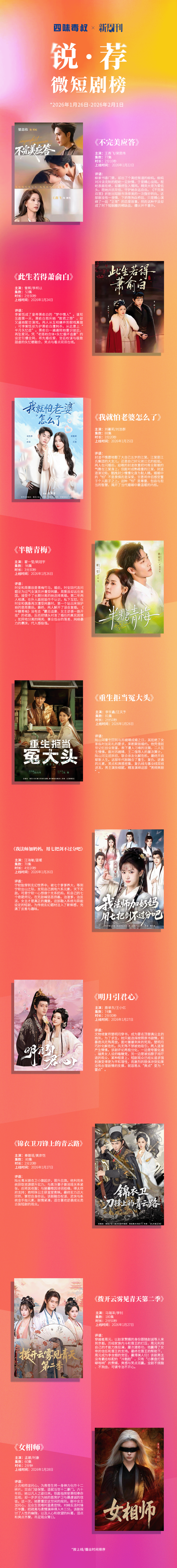 本次「锐·荐微短剧榜」周榜第50期(2026年1月26日——2026年2月1日)