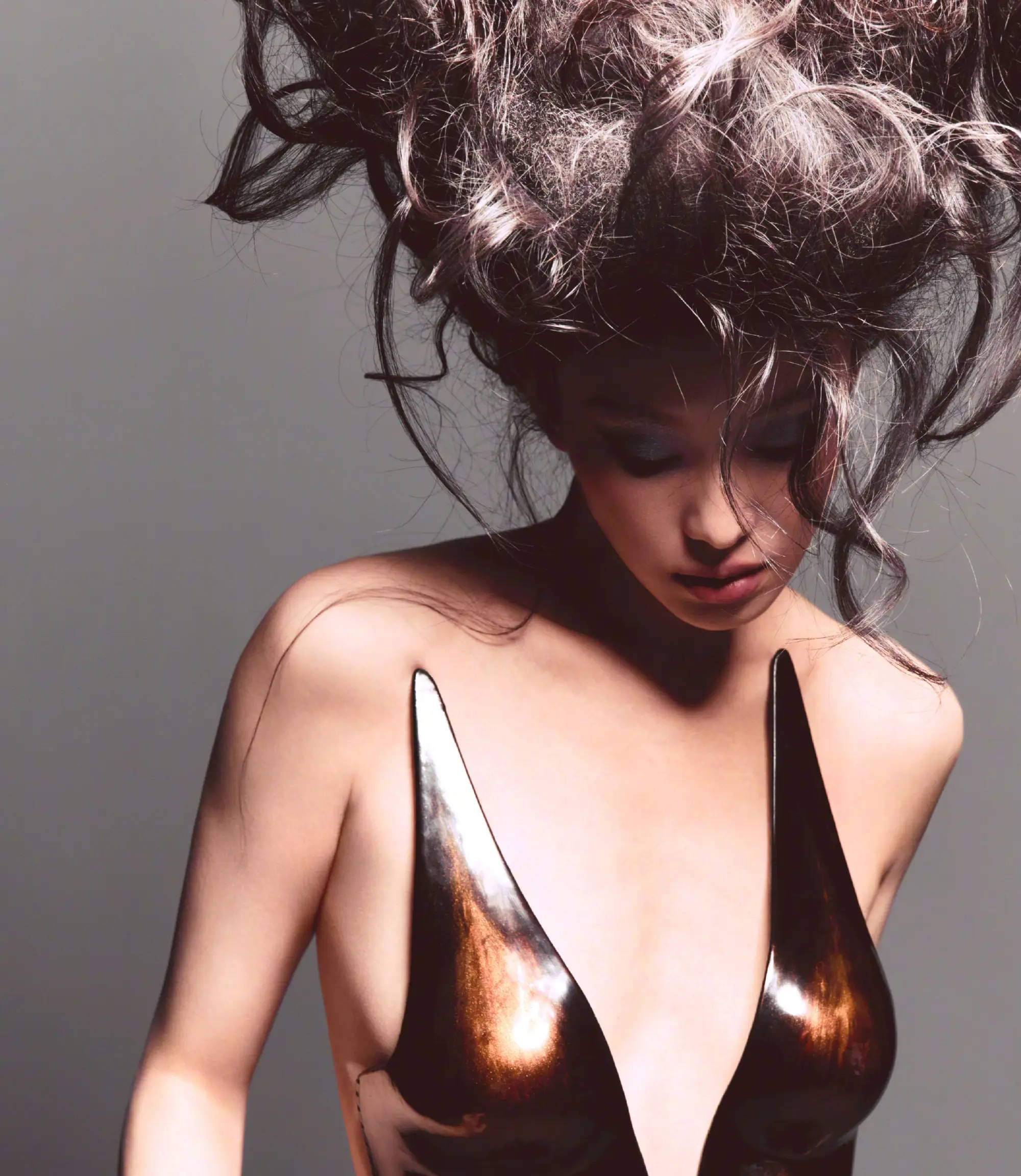 倪妮穿金属质感深V胸衣,尽显骨感凌厉。
