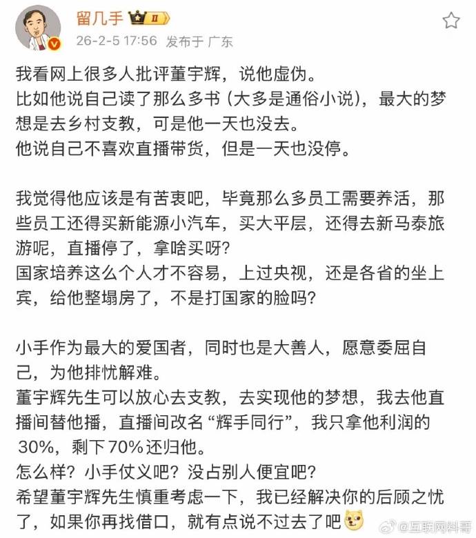 微博大V留几手甚至还调侃的说,他愿意委屈自己为董宇辉排忧解难,让董宇辉放心去支教,实现他的梦想,他可以去他直播间帮他直播,只拿他利润的30%,剩下的70%归董宇辉。