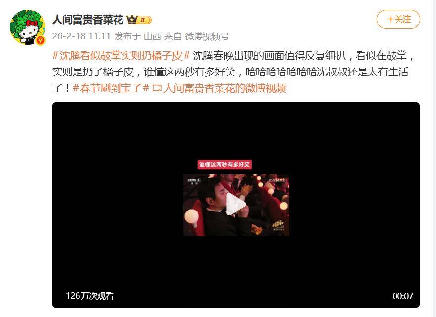 他的动作被戏称为“打扑橘子渣”,有网友发现其慌乱中拍手的姿态,神似动画片《小猪佩奇》里乔治恐龙玩具的滑稽动作。金句也随之频出:“表面在为国家队鼓掌,实际在找橘子皮该藏哪儿”、“沈腾用行动证明,春晚最好的节目在台下”。当晚实时热评一针见血:“导演组可能没想到,整场晚会最有效的笑果,来自一个没交剧本的观众。”