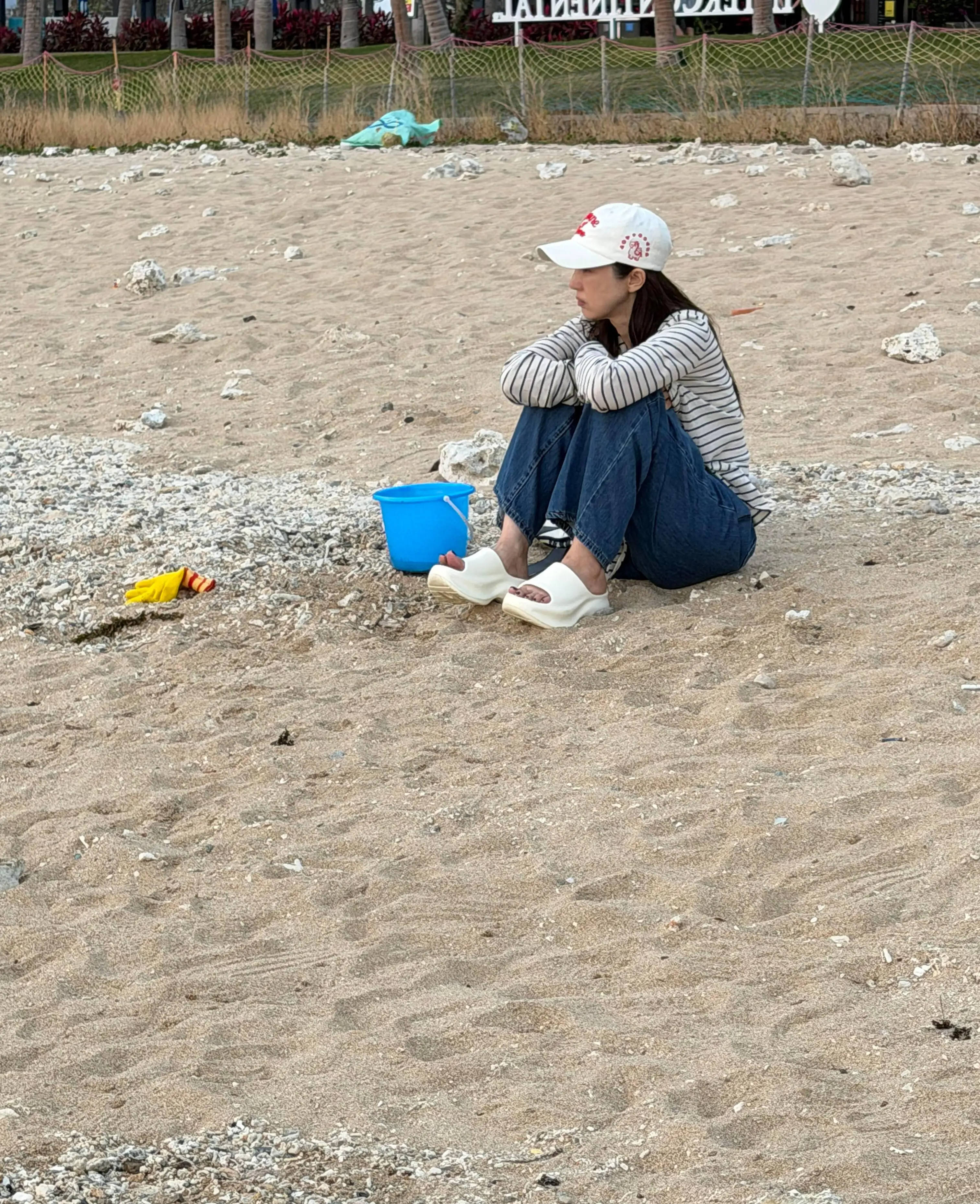 董璇抱膝坐在沙滩上,神情放空。