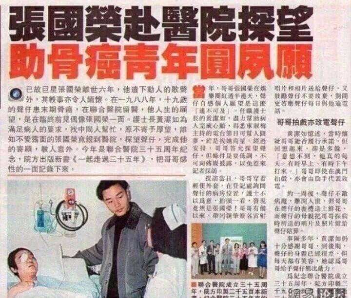 1988年,听说一位19岁歌迷罹患骨癌晚期,哥哥悄悄的前往医院为他庆生,并为他送上签名唱片和写真集。