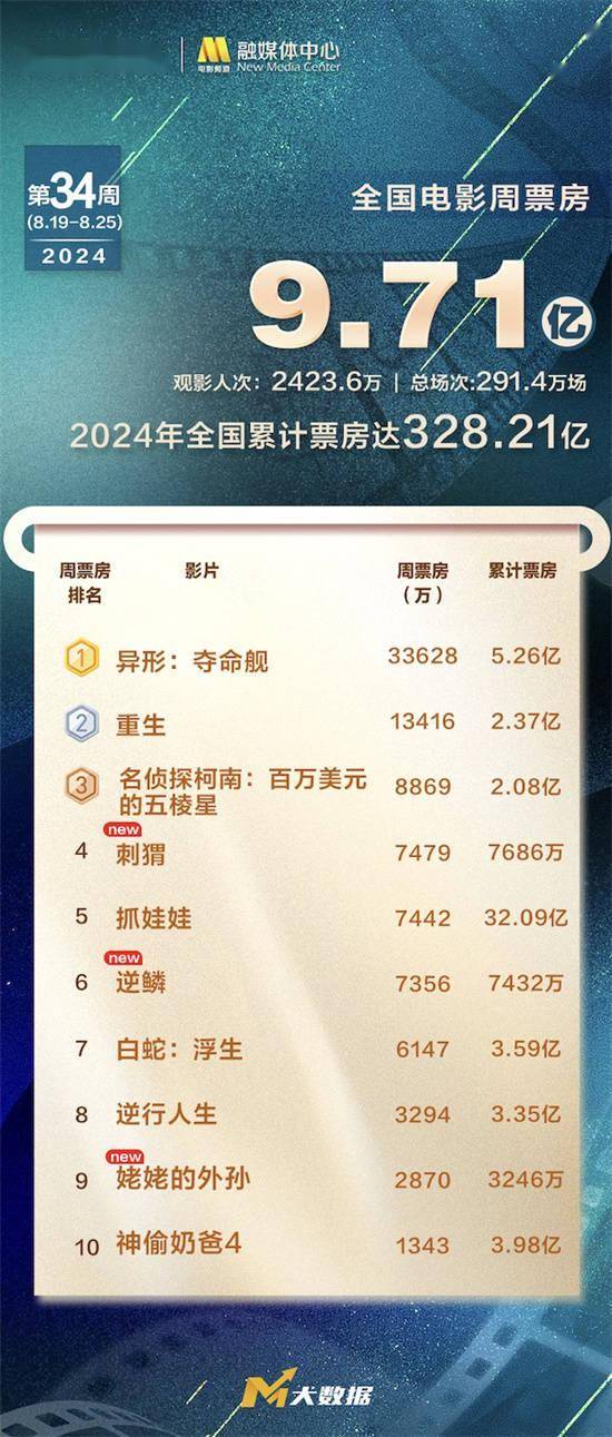 1905电影网讯 2024年第34周(8.19-8.25)全国电影周票房9.71亿元,观影人次超2423万,2024暑期档票房破110亿,全年电影票房累计328.21亿元。