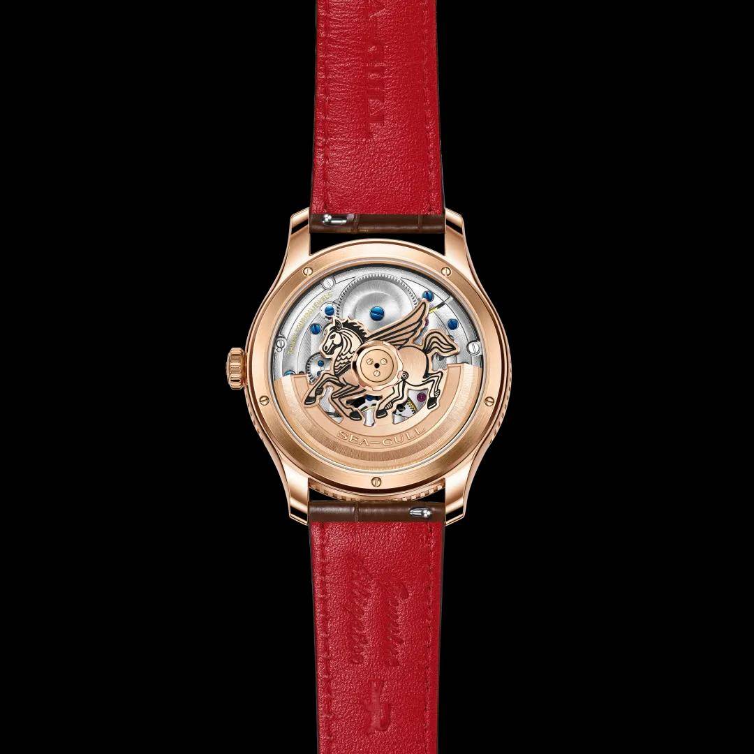 翻过背面,透过蓝宝石底盖,可以看到金色的摆陀被做成了奔马形状,寓意动力源源不断,限量500枚。