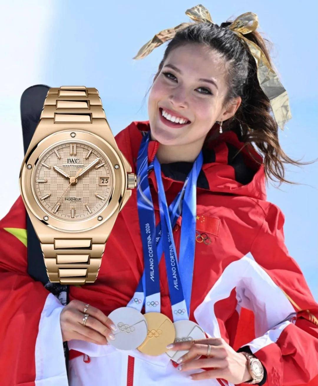 一金二银收官冬奥的谷爱凌,在领奖台上选择了IWC万国表工程师系列自动腕表35。玫瑰金表壳搭配金色网格纹表盘,与她胸前的奥运金牌交相辉映。