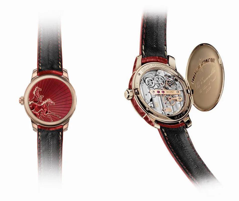 芝柏表带来La Esmeralda “神秘骏马” 陀飞轮腕表,正面就有标志性的三金桥和手工雕刻的奔腾骏马,加上一抹红色的大明火珐琅表盘,红红火火迎接新年~