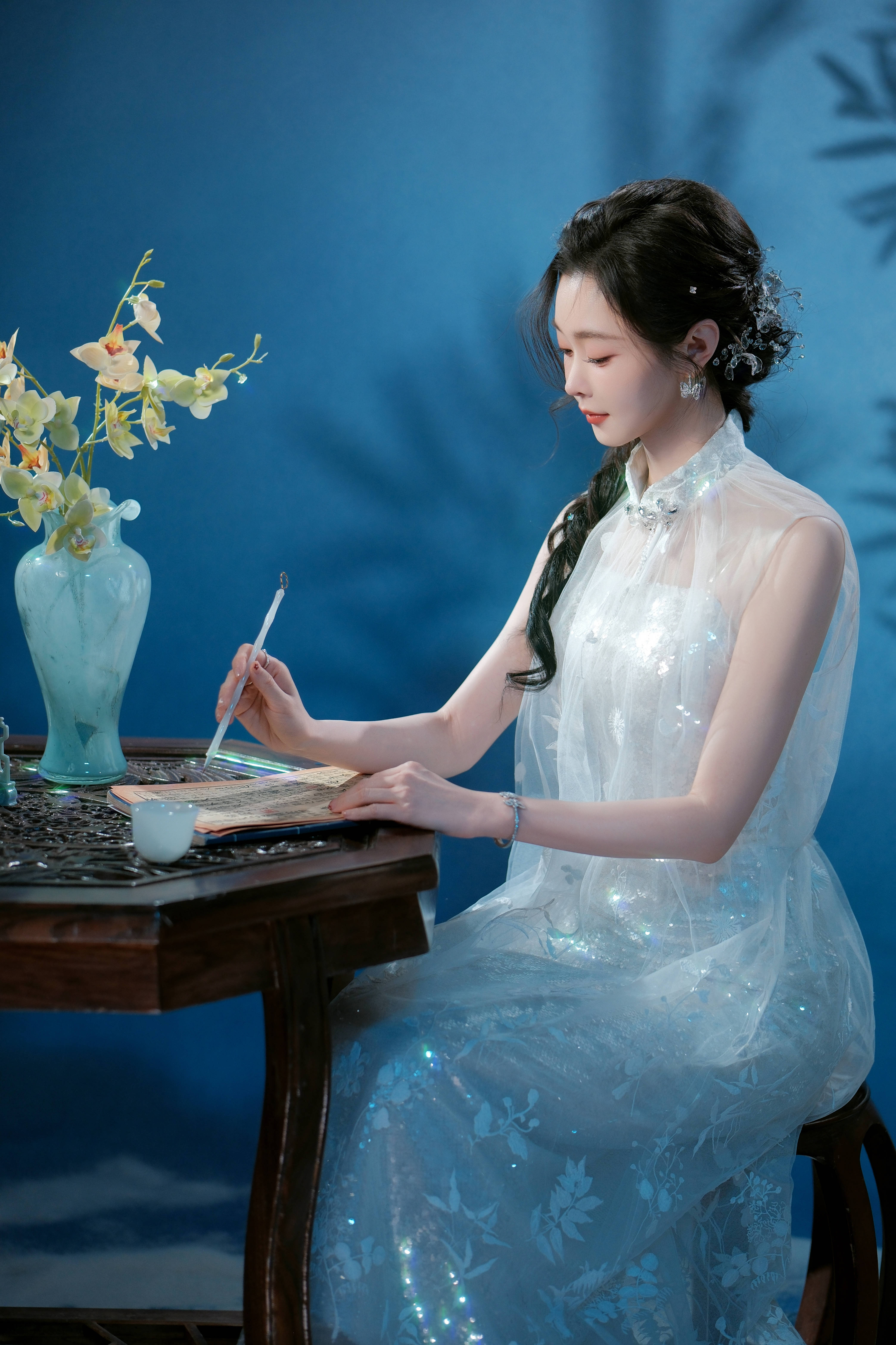 宋轶眼神明亮,正在书写。
