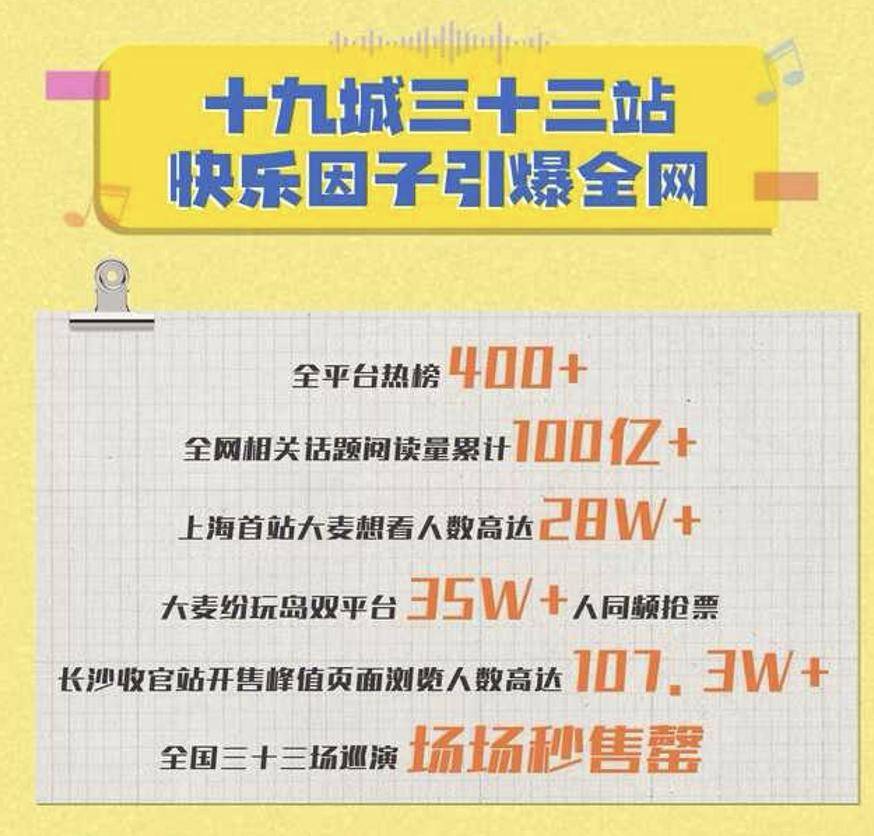 这次直接进入鸟巢的前情,并不是从零开始的想象,而是建立在一轮已经跑完的巡演与数据沉淀之上:《除了快乐禁止入内》此前完成19城33站巡演,形成了相对密集、可追踪的现场样本;传播侧累计带动全平台热榜400+、全网相关话题阅读量100亿+;票务侧也在多个节点呈现过高关注度信号,站站售罄,还有一些如上海首站大麦“想看”20W+、大麦与纷玩岛双平台35W+人同频抢票、长沙收官站开售峰值页面浏览达107.3W+。这些信息更像是对“他如何走到这里”的背景补充——把这次进入国家体育场体系的叙事,放回到一条此前已经发生过的现场路径与市场反馈里。