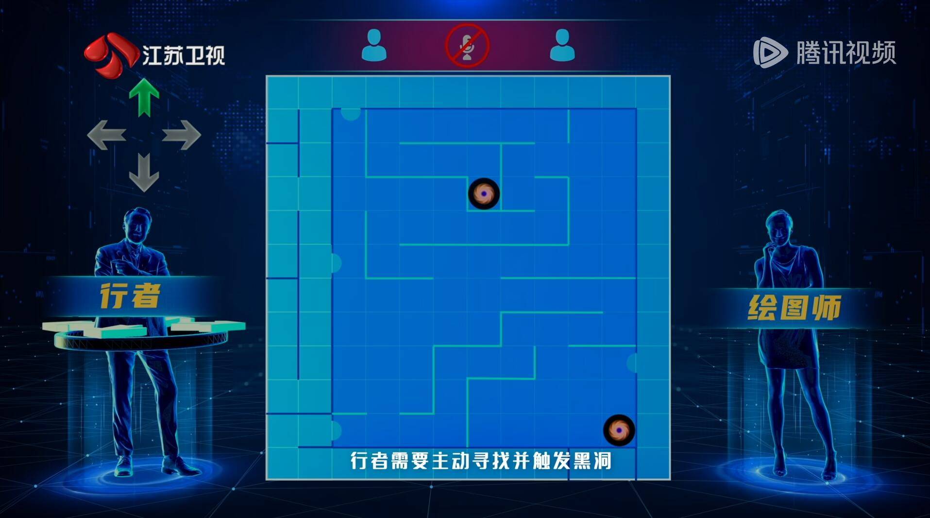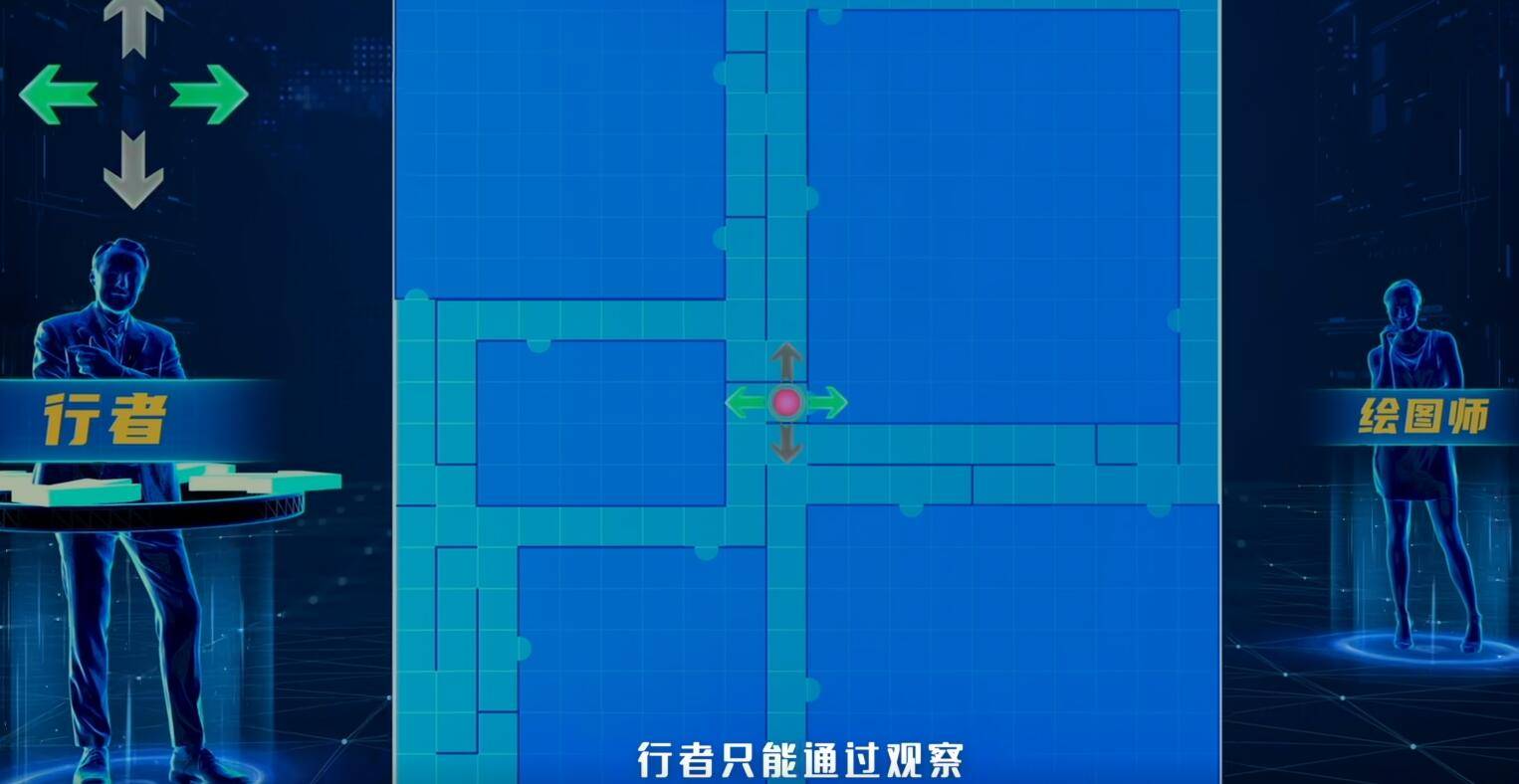 本项目每组有两名选手共同挑战,一名选手担任行者置身迷宫当中,另一名选手担任绘图师,负责绘制迷宫结构。比赛开始后,行者将被空降至迷宫中心,行者只能通过观察四个方向按钮的状态在迷宫中移动,若行者周围无墙体阻挡,则对应的方向按键,将会显示为变量可通行;若行者周围存在墙体阻挡,则对应的按键将显示为灰色不可通行,绘图师可全程看到行者的信号追综点位,并据此同步绘制迷宫结构。挑战过程中,队内可进行实时通讯,迷宫内设有五个迷雾版块,完成任意版块即可获得对应分数,当行者进入迷雾版块后,受迷雾影响,队内通讯将被切断,但信号追综仍可正常显示,并且部分迷雾版块内设有黑洞,行者需要主动寻找并触发黑洞,才能抵达或撤离特定区域,并完成全部的版块探索。