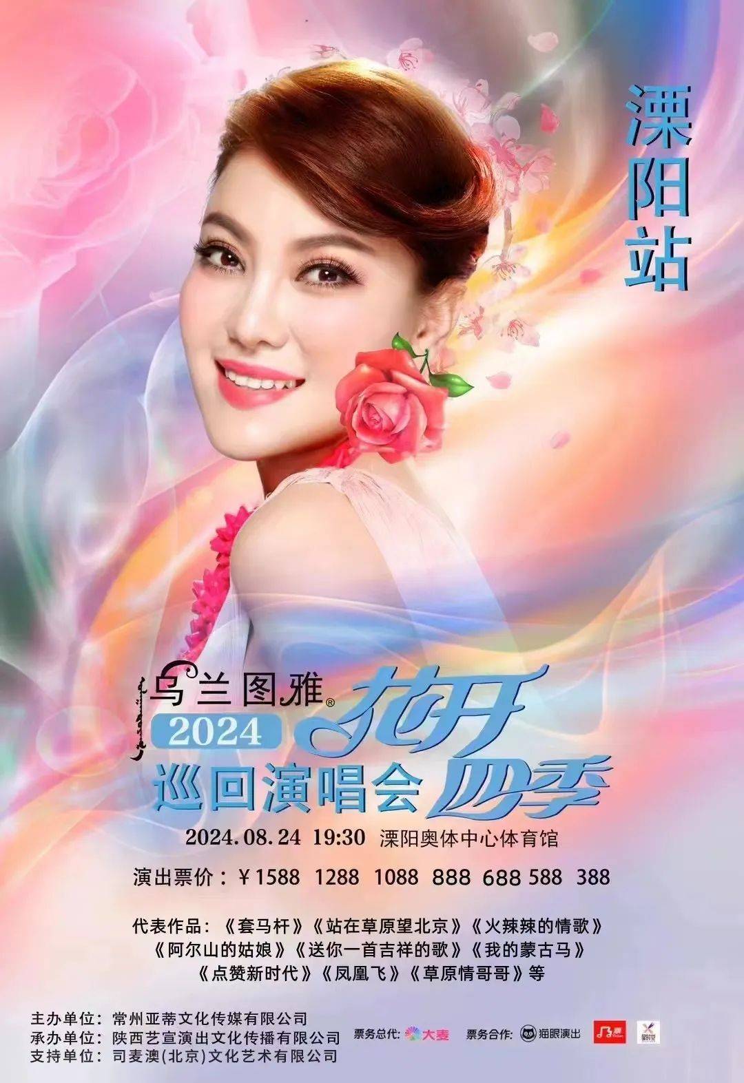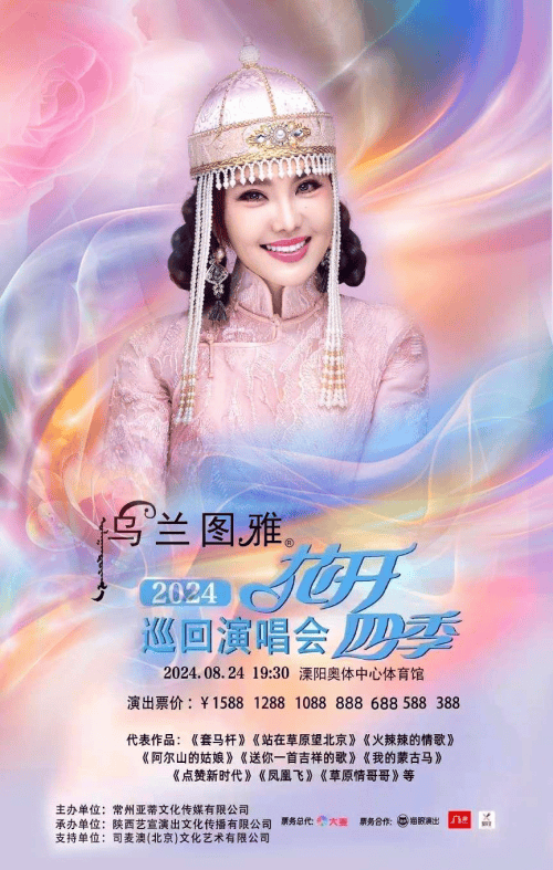 让我们一起期待8.24乌兰图雅“花开四季”巡回演唱会溧阳站的到来,并在这场视听盛宴中,感受套马汉子的威武雄壮,感受天边草原的宽广无垠,感受草原儿女的激情豪迈,感受为爱歌唱的磅礴力量。