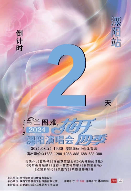还有2天,8.24乌兰图雅“花开四季”溧阳站演唱会即将开唱,超炫的舞台加燃情的歌声,必将为观众为观众呈现一场跨越四季、穿越心灵的音乐旅行。
