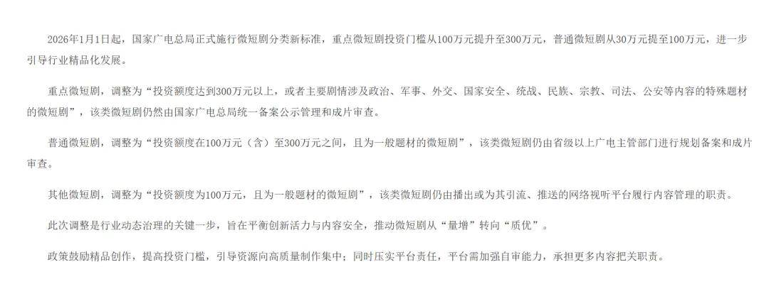 从2026年1月起,广电总局将重点微短剧的投资门槛从100万元提升至300万元。这代表了行业共识的形成:短剧要想走得更远,就得按电影的规矩来——更合理的制作周期、更精良的服化道、更专业的创作团队。