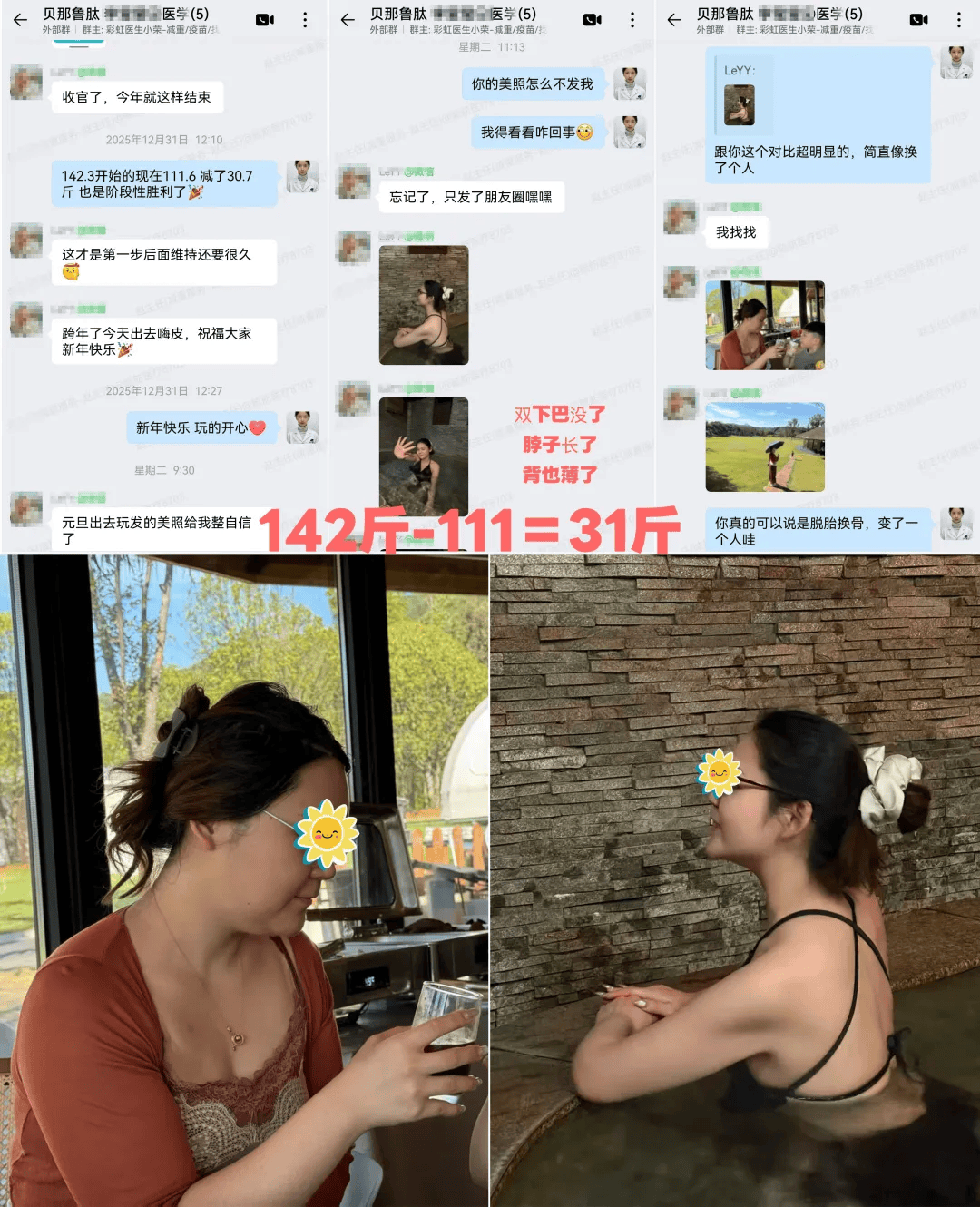 粉丝栗子→初始体重139.4斤,属于中大基数,腰腹部赘肉多。12月18日收到针剂,初始体重:139.4斤。截止到1月19日,体重: 127.8斤。