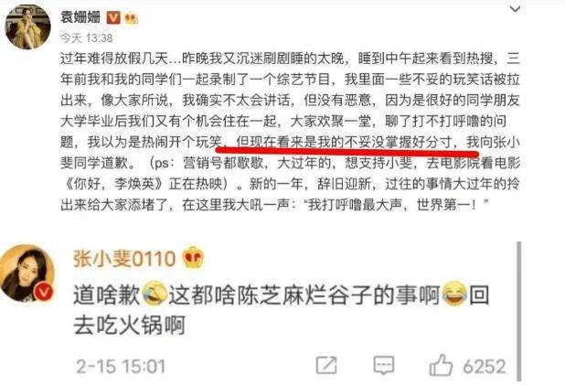张小斐火了后,袁姗姗发文向她道歉,承认当时说话没分寸,张小斐留言称“道啥歉啊,回去吃火锅”,她已经原谅了她。但很多网友还是因此不喜欢袁姗姗,质疑她是过来蹭热度的,假如张小斐不红,她不一定会发文道歉。
