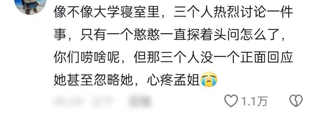 那期节目播出后,沈月单依纯李雪琴都被吐槽了,不少网友说她们抱团“孤立”孟子义,代入一下如果是在学校的四人宿舍,三个人讲话不理另一个人,真的挺难受的。