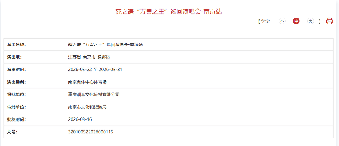 3月16日,薛之谦“万兽之王”巡回演唱会南京站审批通过,薛之谦将在奥体中心体育场连开多场,演出时间从5月22日起到5月31日止。“万兽之王”世界巡回演唱会是薛之谦举办的第四轮巡回演唱会。舞台采用四面台结构,巨型机械兽笼装置为演唱会带来震撼视觉效果。