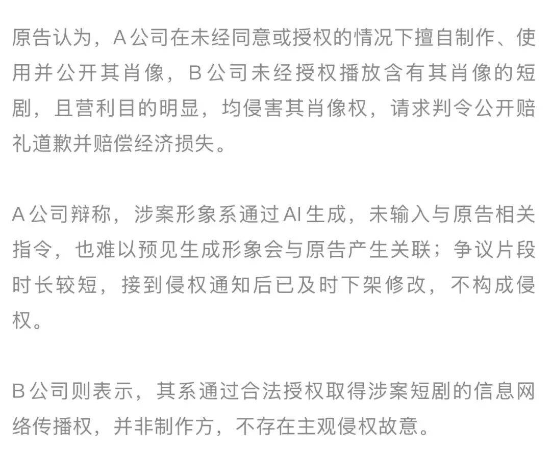 据北京互联网法院消息,法院认定,短剧制作方擅自使用深度合成技术生成与某演员高度相似的形象,侵害其肖像权;短剧播出方未尽合理审查义务,同样承担相应责任。