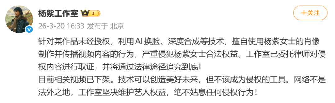 3月20日,杨紫工作室发文:针对某作品未经授权,利用AI换脸、深度合成等技术,擅自使用杨紫女士的肖像制作并传播视频内容的行为,严重侵犯杨紫女士合法权益。工作室已委托律师对侵权内容进行取证,并将通过法律途径追究到底!
