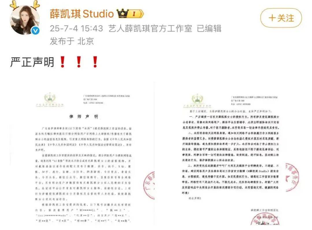 此外,演员薛凯琪曾发布“严正声明”,抵制“用AI换脸制作不雅视频”的行为;演员王劲松、温峥嵘等人也曾就“利用AI虚假代言”的现象发声......