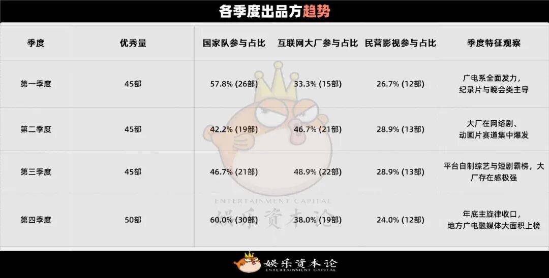 好内容离不开好推手。当娱乐资本论穿透这近397部作品背后的出品方结构时,一幅“国企+大厂+民营”协同作战的生动图景跃然纸上。