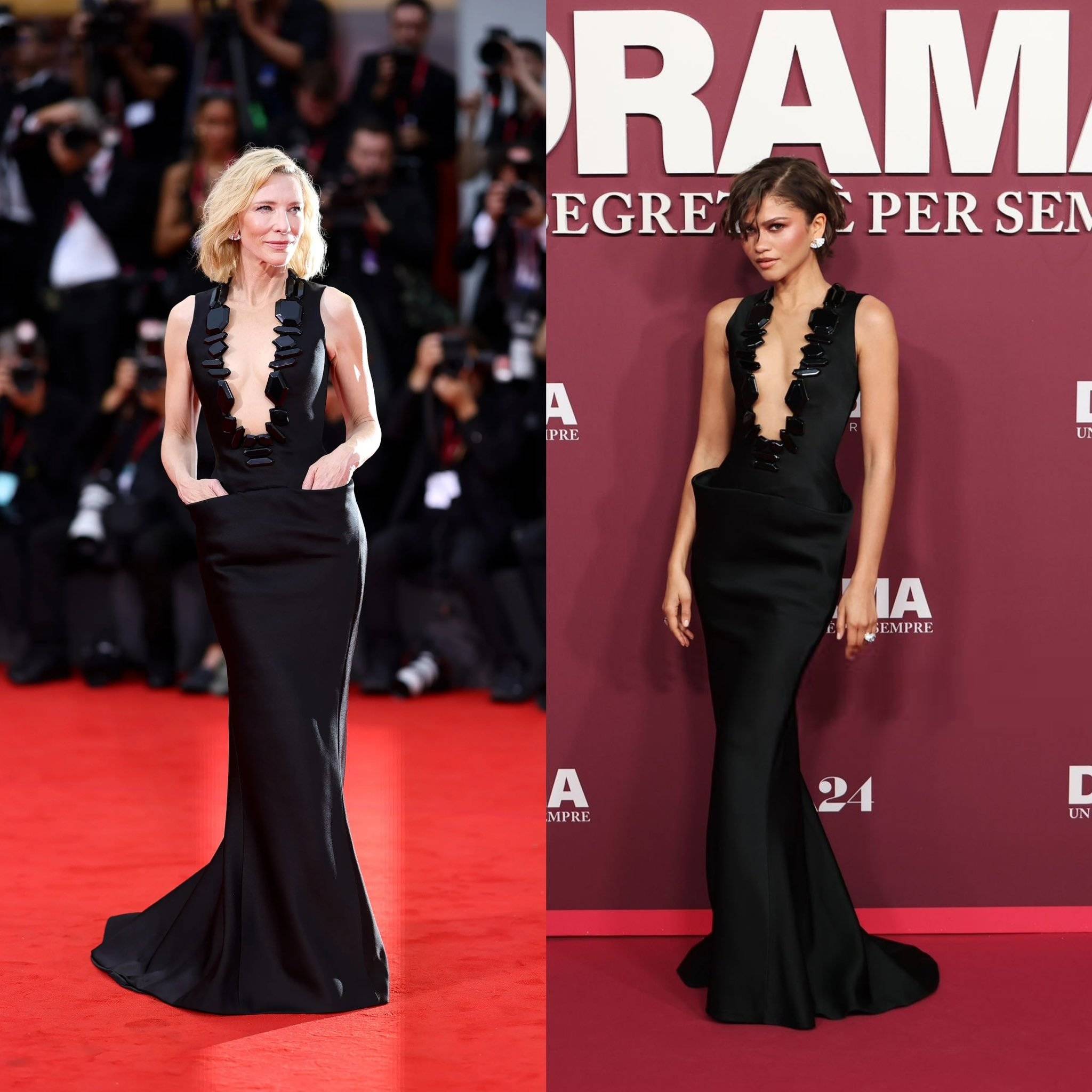 搜狐娱乐讯 赞达亚亮相《爱情抓马》罗马首映红毯,这套黑色深V裙装凯特·布兰切特曾在2022的SAGA Awards以及2025年的威尼斯电影节穿过。