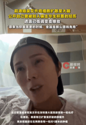 近日,前港姐季军吴文忻在深圳港大医院接受新一轮化疗。检查后,除原有已扩散至肝脏的肿瘤外,再发现脑部左右两侧各有一粒约1厘米的肿瘤。