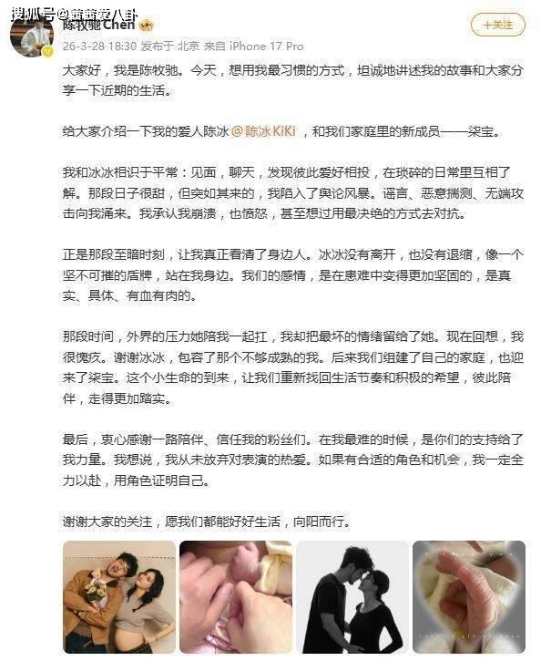 陈牧驰率先发布近千字长文,开篇便直白介绍:"给大家介绍一下我的爱人陈冰 @陈冰 KiKi,和我们家庭里的新成员 —— 柒宝"。