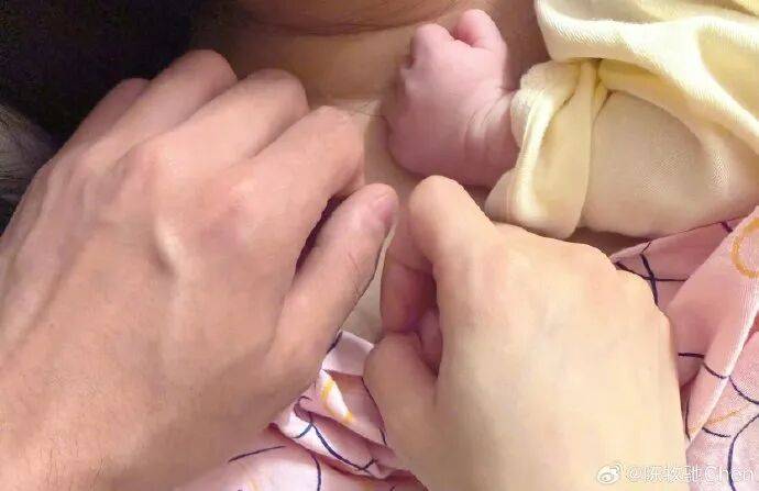 后面陈牧驰还贴了自己和陈冰的合照以及和宝宝小手一块拍的照片。