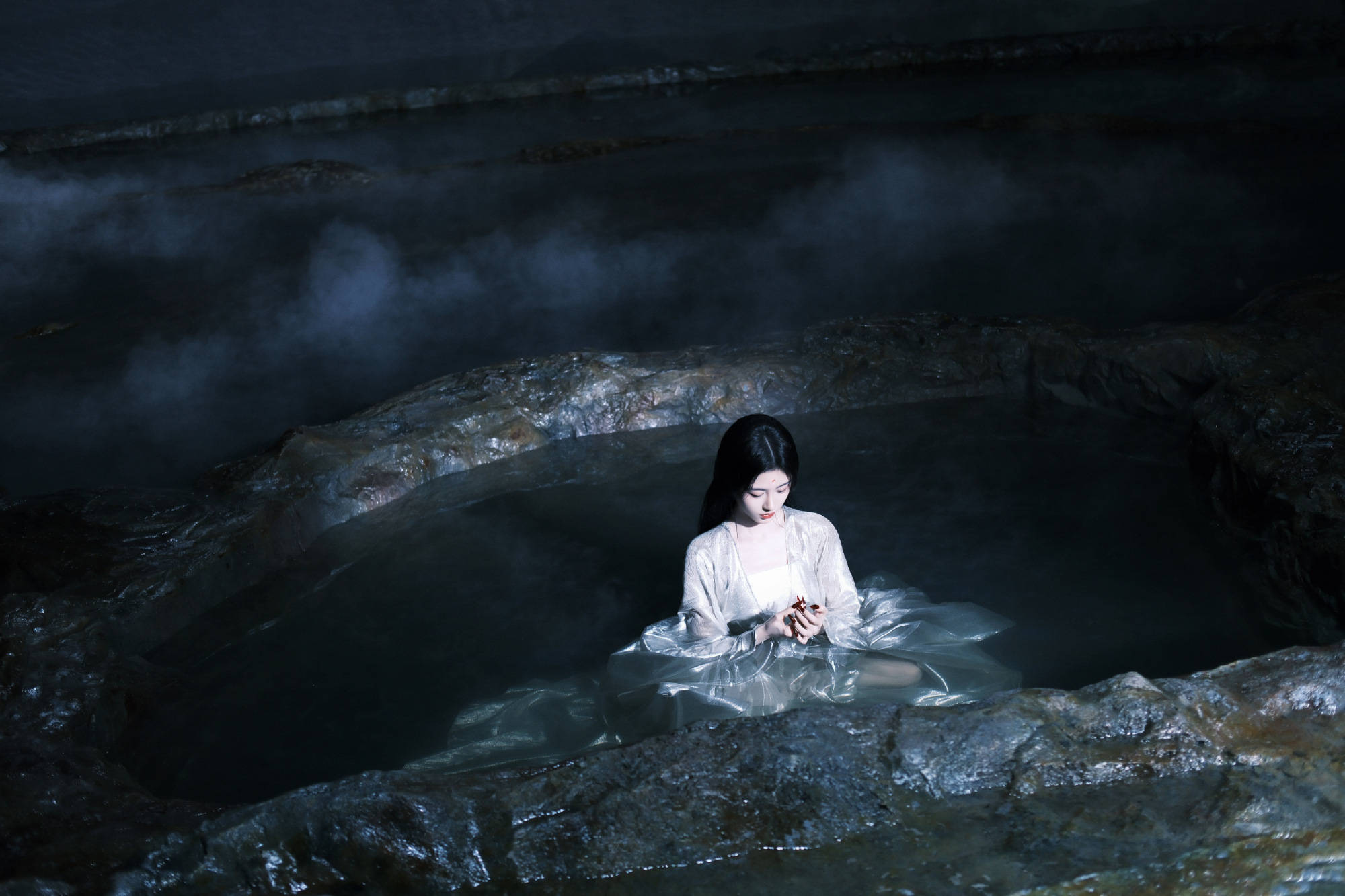 鞠婧祎端坐池水中,银纱造型仙气飘飘。
