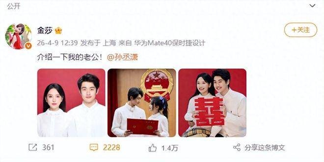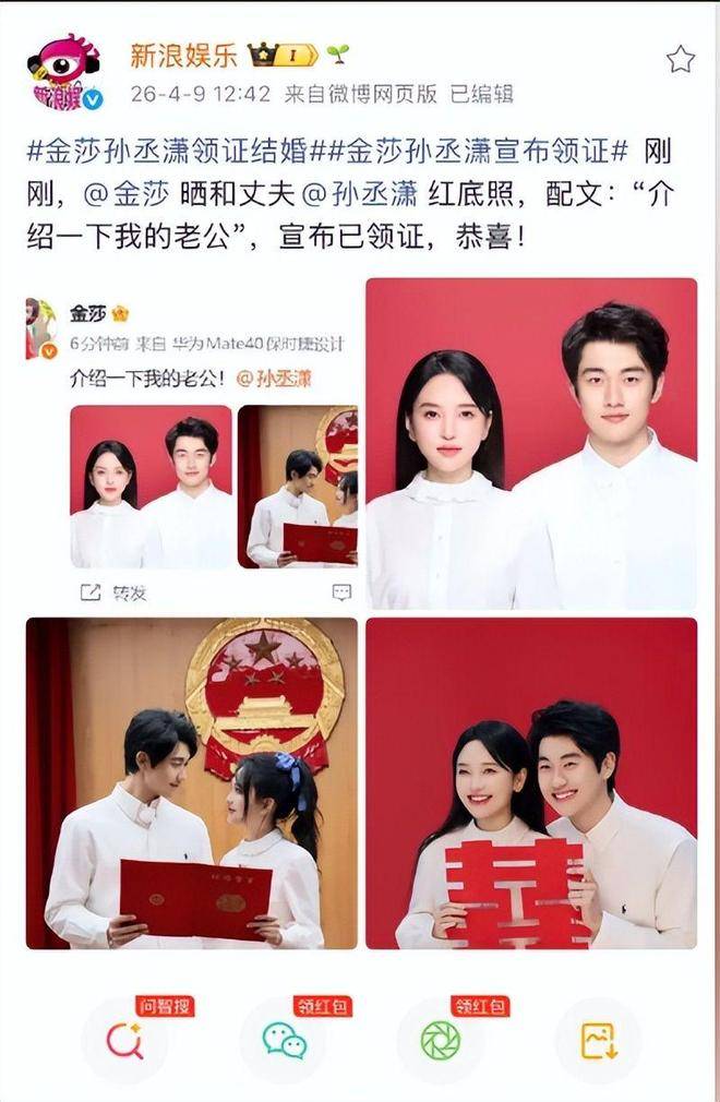 出乎意料的是,在节目播出不久后,金莎直接在社交平台官宣婚讯,晒出红底结婚照。照片中,两人身穿白衬衫,笑容坦荡自然,领证日期写着2月13日,地点为海淀区民政局。