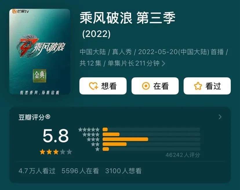 《浪姐7》的另一大挑战是阵容。节目办到第七季,前六季已经消耗掉180多位30+女明星,寻找嘉宾难度可想而知。开播前,网传名单中有张曼玉、陈慧琳、林志玲等具备国民度和话题性的女明星,但一个也没请到。正式名单一公布,《乘风2026》立刻被网友戏称为最糊的一届浪姐。 这种评价并非完全出于刻薄,浪姐IP的确呈现出肉眼可见的疲态。翻看六届浪姐的豆瓣数据,信号已十分明显。2020年,在宣传不足的情况下,《乘风破浪的姐姐》工作日中午空降播出,最终超过17.2万人在豆瓣打出6.8分,开播即爆款,出道即巅峰。17万人、6.8分,是浪姐IP迄今为止的最高记录。此后五季,口碑再无及格。第三季,节目名去掉了姐姐,改为《乘风破浪》,靠着王心凌的情怀杀和CP叙事再度破圈,但打分人数却滑落到约4万。这种从社会话题向粉丝圈层的收缩,在随后的几季中表现得愈加明显。