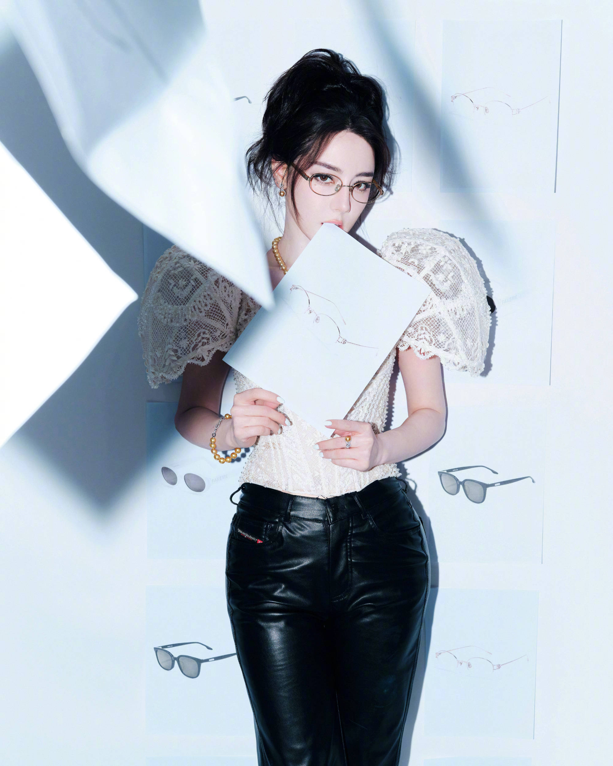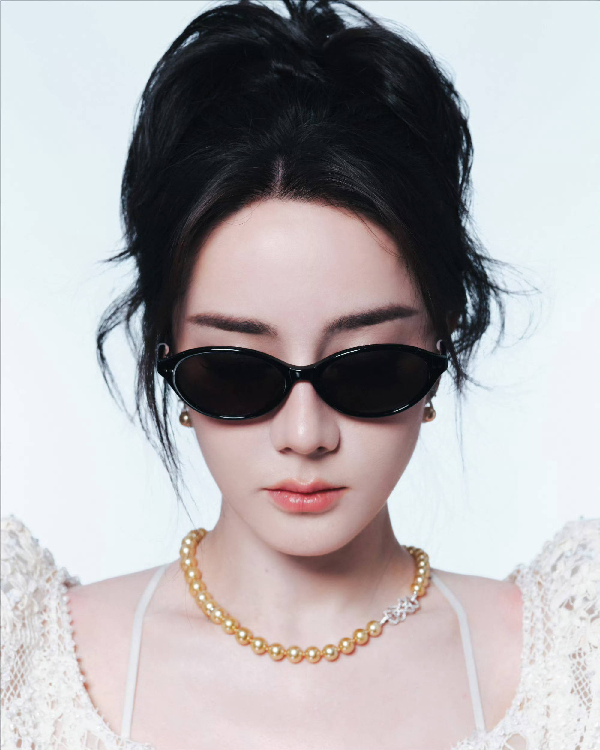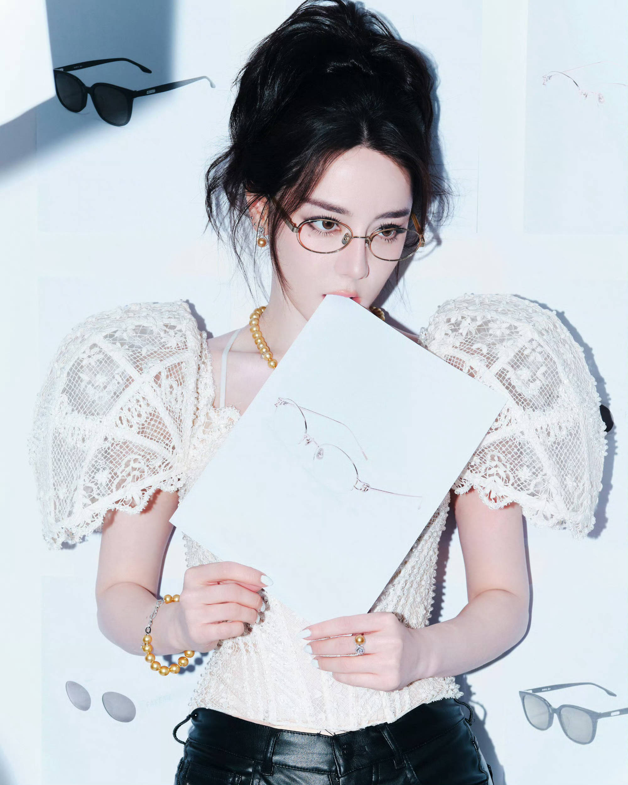 迪丽热巴手轻扶墨镜,珍珠项链与蕾丝衫呼应,,尽显摩登女郎风范。