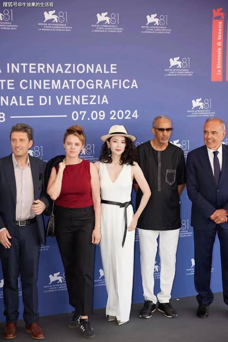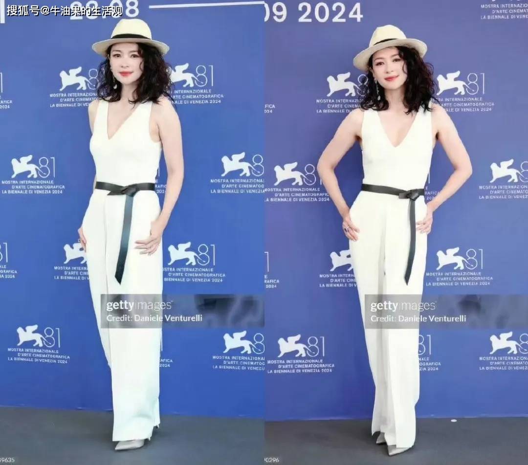章子怡是标准的电影脸,无论从哪个角度拍都好看,威尼斯电影节红毯上的章子怡穿着白色无袖连体衣,中间绑着黑色的腰带,拉高腰线的同时,也给衣服增加时尚气息。