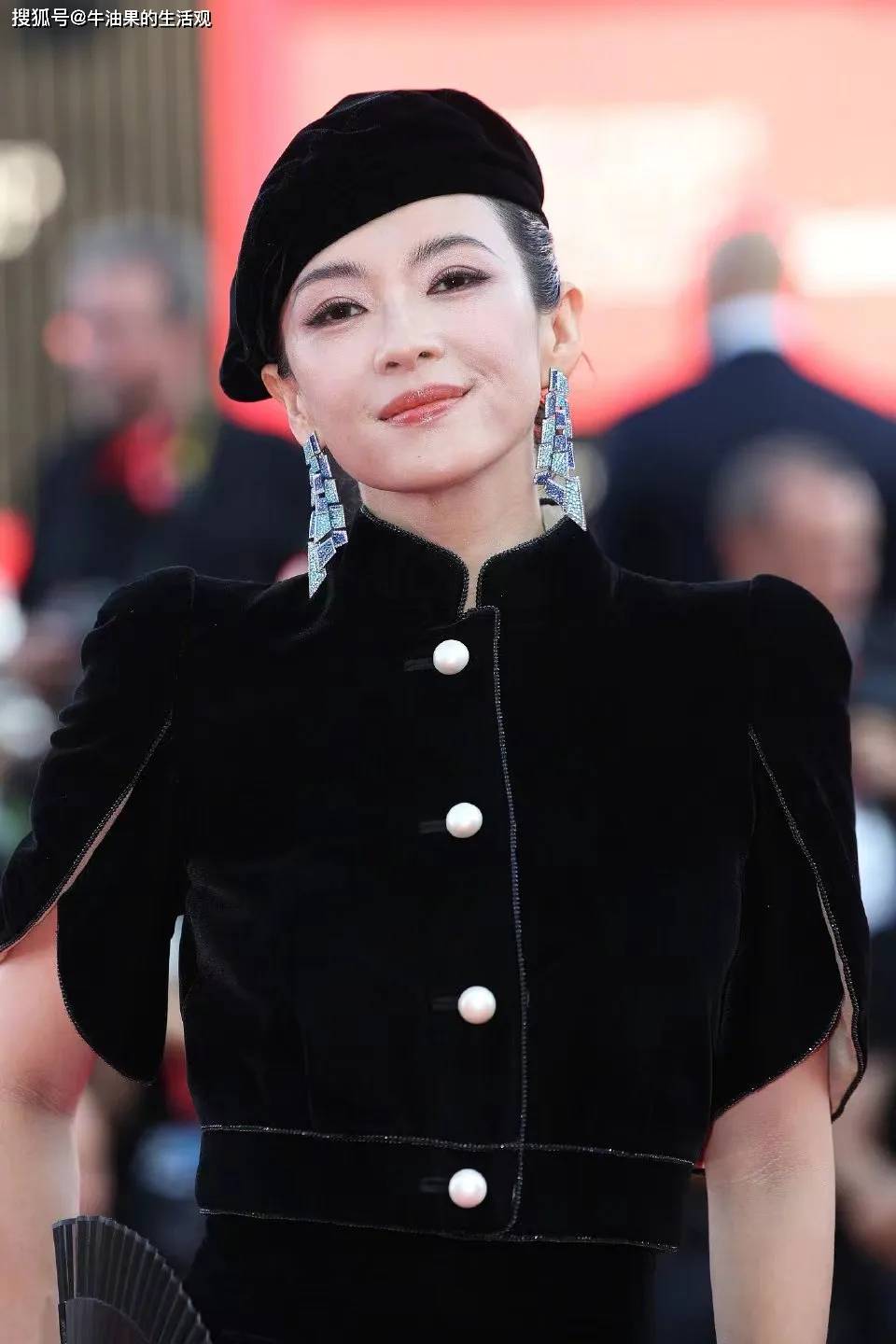 v领的设计能衬托章子怡的天鹅颈,无袖的设计让章子怡的直角肩一览无遗,而她的齐肩卷发戴上礼帽,显得知性又洋气,艳压旁边的洋人女星,不愧是国际章。