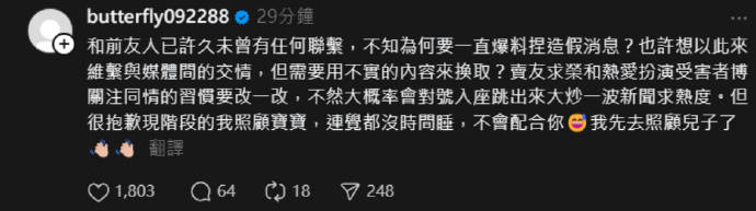 搜狐娱乐讯 9月4日,蝴蝶姐姐胡恺乐在社交平台发文官宣自己喜得儿子,正式升级当妈妈。蝴蝶姐姐表示:“和前友人已许久未曾有任何联击,不知为何要一直爆料捏造假消息?也许想以此来维繁与媒体问的交情,但需要用不实的内容来换取?但很抱歉现阶段的我要照顾宝宝,连觉都没时间睡,不会配合你,我先去照顾儿子了。”