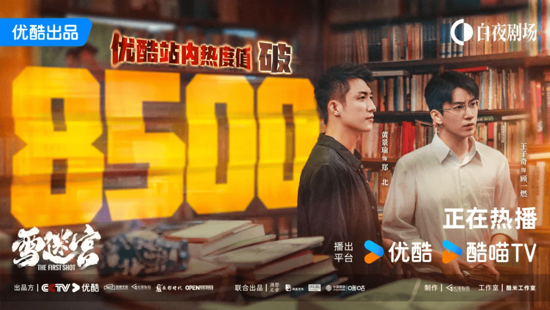 9月3日,张艺谋监制, 黄景瑜、章宇、王子奇、谢可寅、林博洋、刘润南、赵昱童等主演的喜剧悬疑《雪迷宫》登陆优酷白夜剧场,再度验证了优酷的“爆款体质”。上线后《雪迷宫》拿下猫眼专业版全网热度日榜第一,目前该剧站内热度破8500,延续了优酷白夜剧场的全优战绩。
