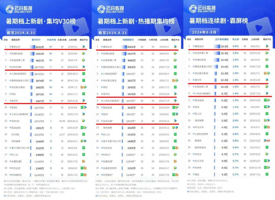 云合数据发布的2024剧集暑期档报告显示,《墨雨云间》强势屠榜,在“连续剧·霸屏榜、集均v30榜单、上新剧·热播期集均榜”三榜中位列第一,与第二名甩开较大距离,是云合认证的今年暑期档唯一一部播放量达S+的作品。