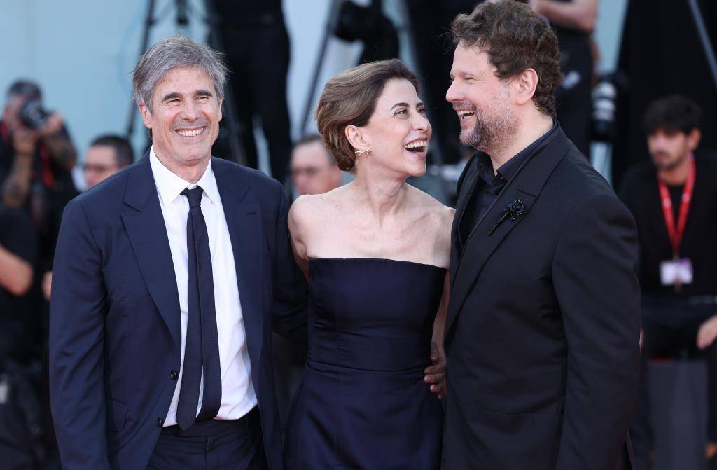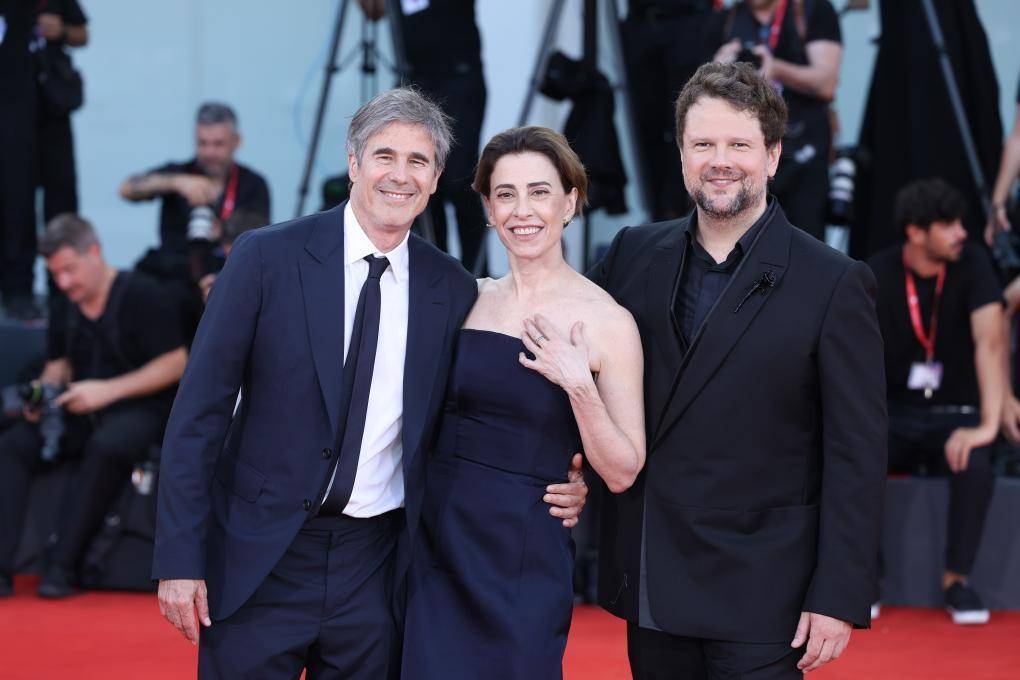 9月1日,在意大利威尼斯举行的第81届威尼斯国际电影节上,主竞赛单元影片《我仍在此》导演瓦尔特·萨列斯(左)和演员费尔南达·托雷斯(中)、塞尔顿·梅洛亮相首映式红毯。新华社记者 李京 摄