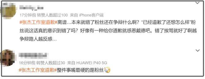 只是粉丝们并不这样认为,他们表示张杰已经道歉了,某些正义之士应该适可而止,不要再扩大影响,又再次把锅甩给了路人,路人何其无辜。而且,事情做错了躺平接受挨打就好,勇敢承担责任,不是路人把你们做错的事情说一遍就是扩大影响。